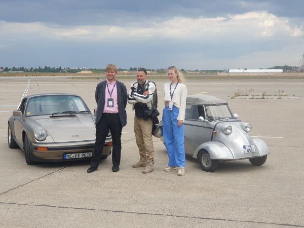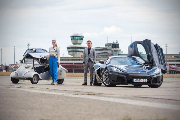 Ava Koenzen vom Projekt classic eCars mit einem umgebauten Messerschmitt-Kabinenroller und Nico Rosberg neben dem Rimac Nevera. Lesen Sie den ganzen Artikel bei der Berliner Zeitung